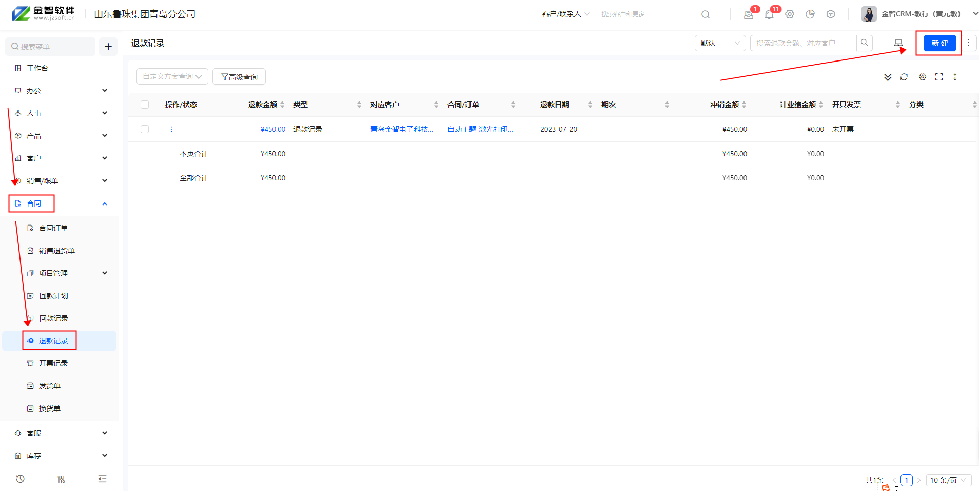 方法1、PC端【合同】-【退款记录】-右上角【新建】