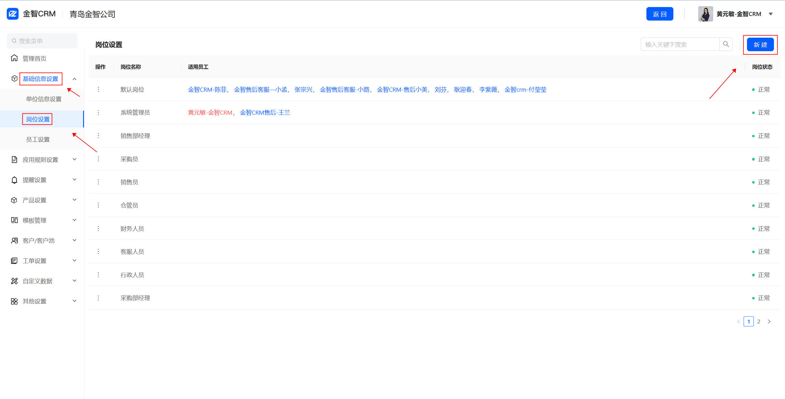 PC端:右上角【系统设置】-【基础信息设置】-【岗位设置】-【新建】