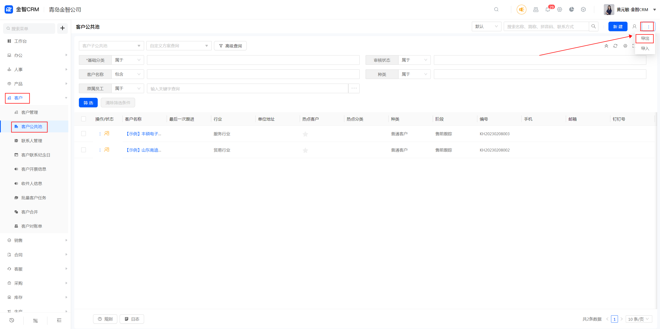 PC端:【客户】-【客户公共池】-新建旁边的【更多】-【导出】按钮进行导出,可以通过查询或高级查询、自定义方案查询等快速筛选需要导出的数据进行导出,不选择默认导出全部数据。