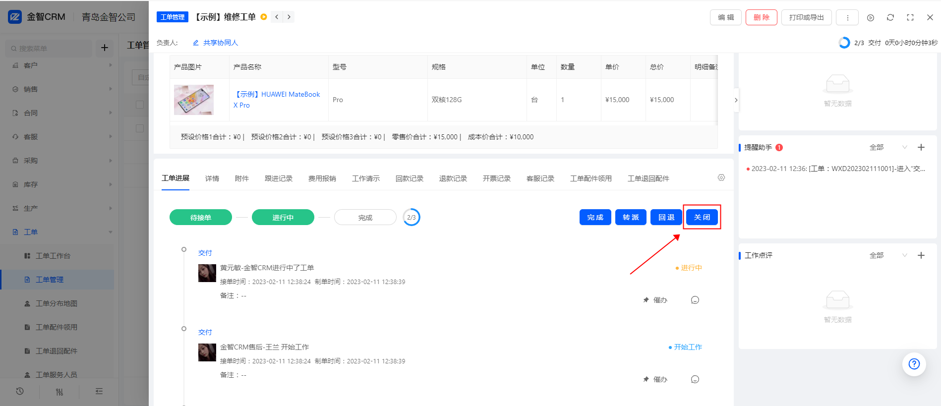 (2)工单执行过程中,不再需要继续执行的,可关闭工单。关闭工单后,不再进行流转派单,关闭的工单支持重启再次进入执行环节。