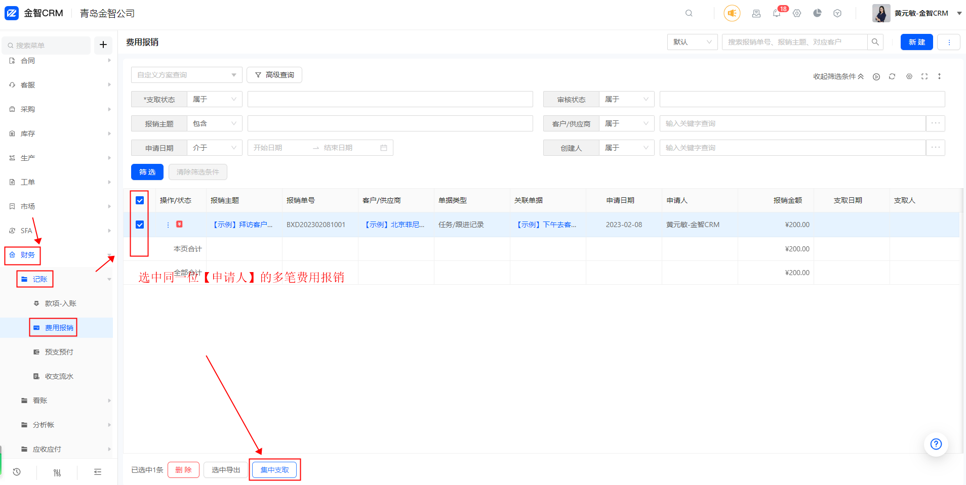 当同一位员工陆续提交了多笔费用报销单,财务人员定期统一支取时(例如月底统一报销),可以针对同一位员工(即申请人)进行支取。