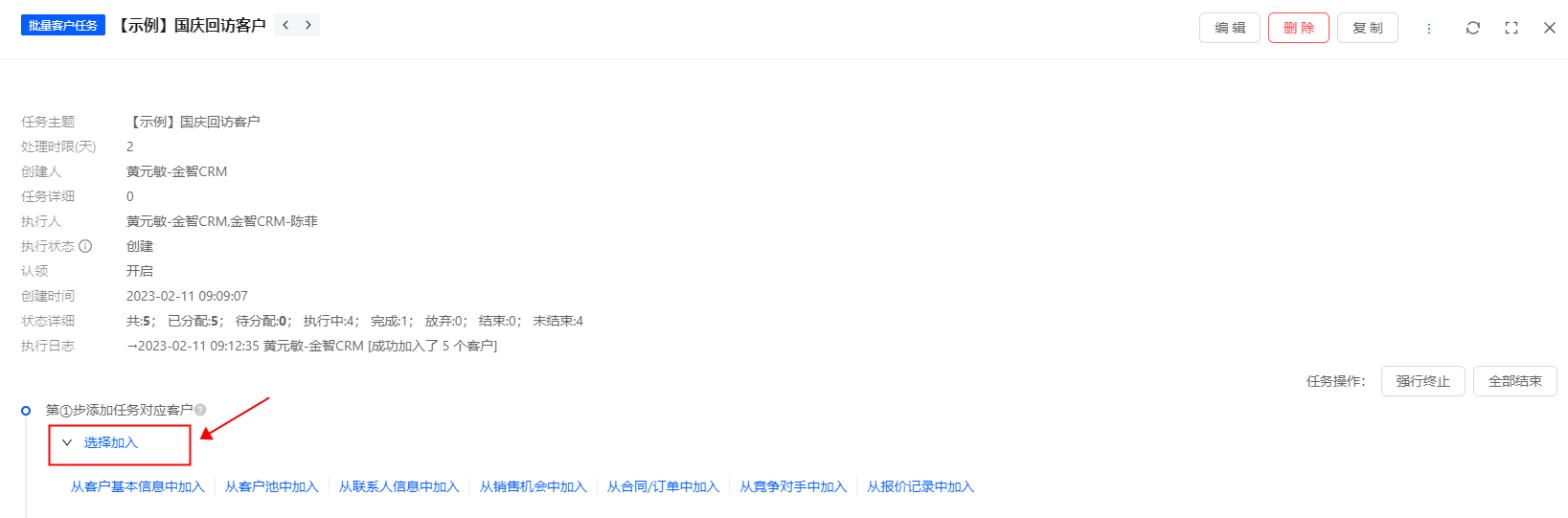 (1)在客户任务详细页面,按照第①步添加任务对应客户。对于客户的选择,可以根据需求从客户基本资料、从联系人或者其他分类中进行筛选;