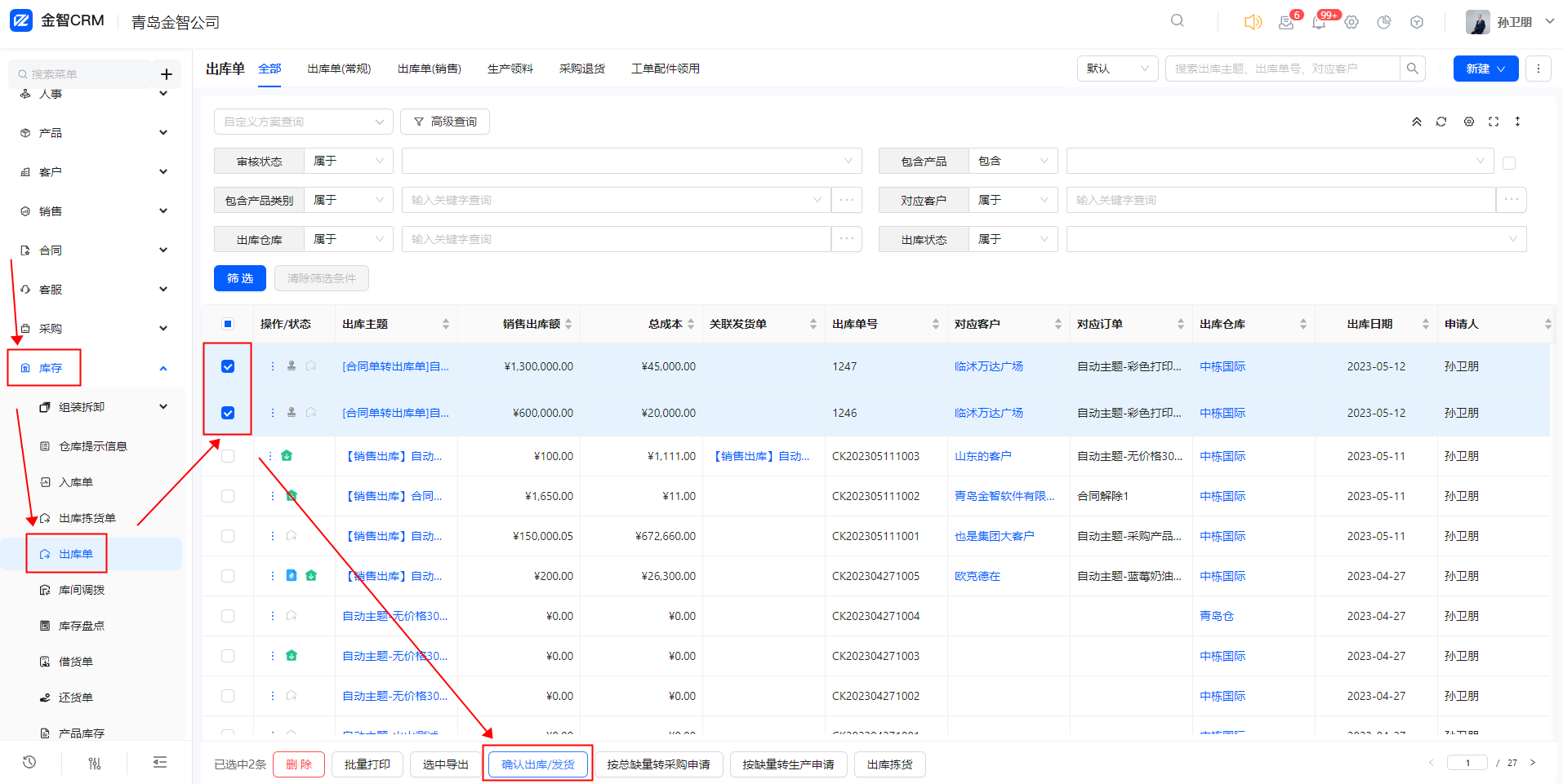 1 | 批量确认出库/发货 | 【库存】-【出库单】-选中多个出库单-【确认出库/发货】 注:只有该仓库对应的库管员才可以操作 | ![]() ![]() |