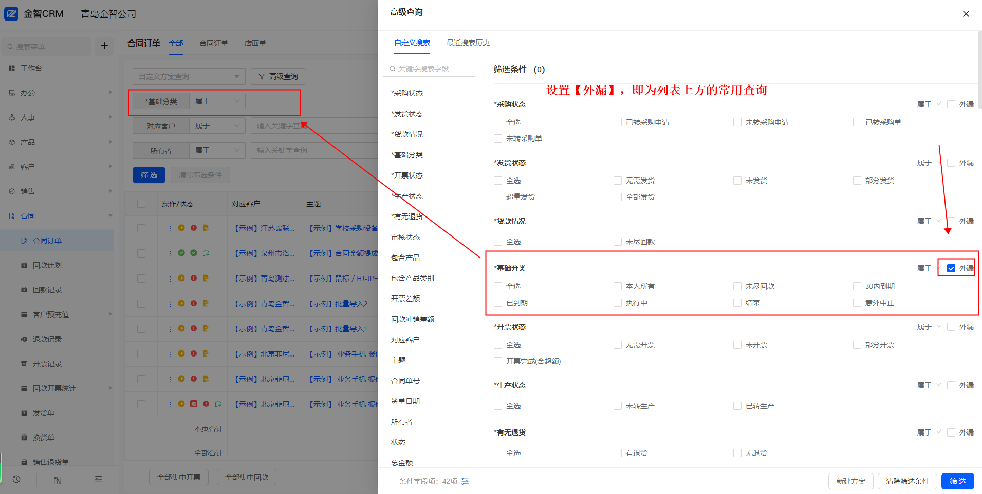 以合同订单为例,【合同】-【合同订单】-顶部的常用查询字段中填写条件后-点击【筛选】