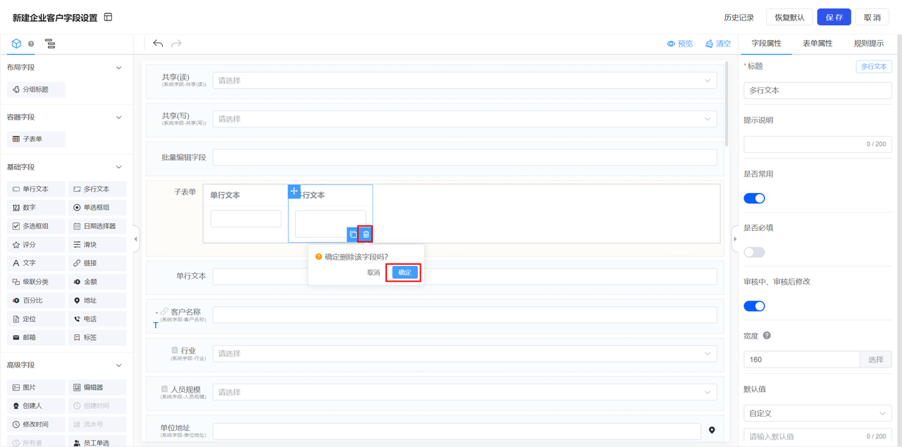 (2)点击删除字段时,给出弹窗“确定删除该列字段?”,用户确定后,表单列删除,避免误操作删除。