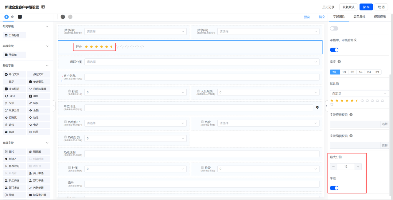 选择评分组件增加最大分值输入,默认是5分,可选开启是否允许选半颗星。