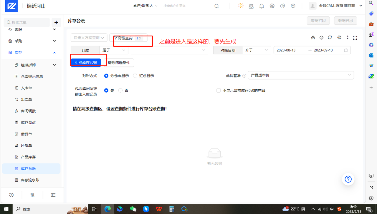 进入库存台账,调整为对账日期默认为“当天”,只查询当天的库存数据