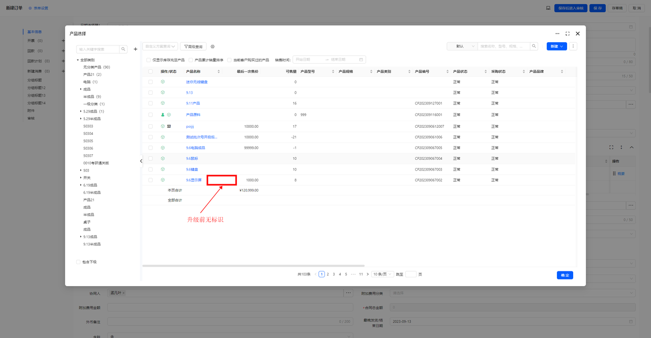 合同订单、采购单,新建页面,选择产品页面,如果具体的客户曾经购买过的产品、或者从供应商处曾经采购过的产品,在没有筛选顶部勾选:当前客户购买过的产品,也能显示“卖过”标记,方便快速选择产品作为参考。