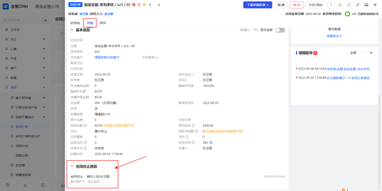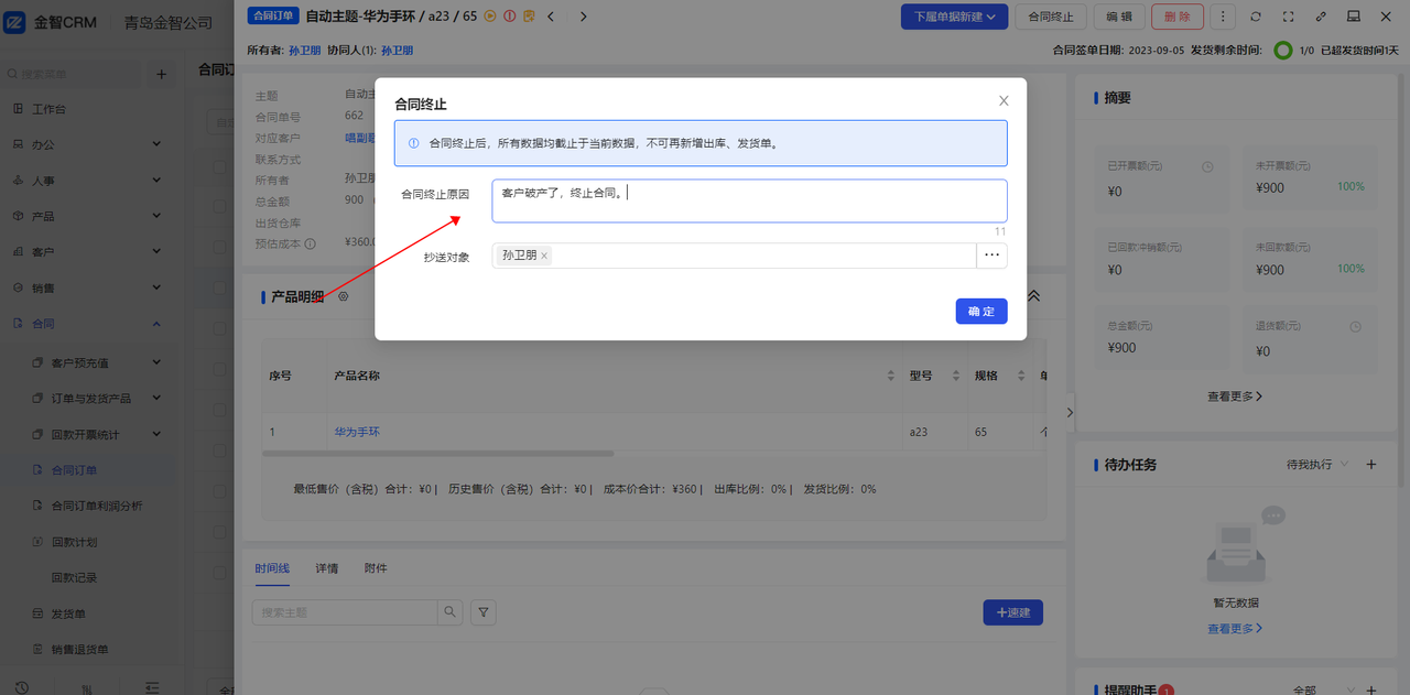 合同终止后,不影响合同进行回款,如果合同终止后,继续新增发货、新增出库、新增发货,将进行限制添加单据的控制。