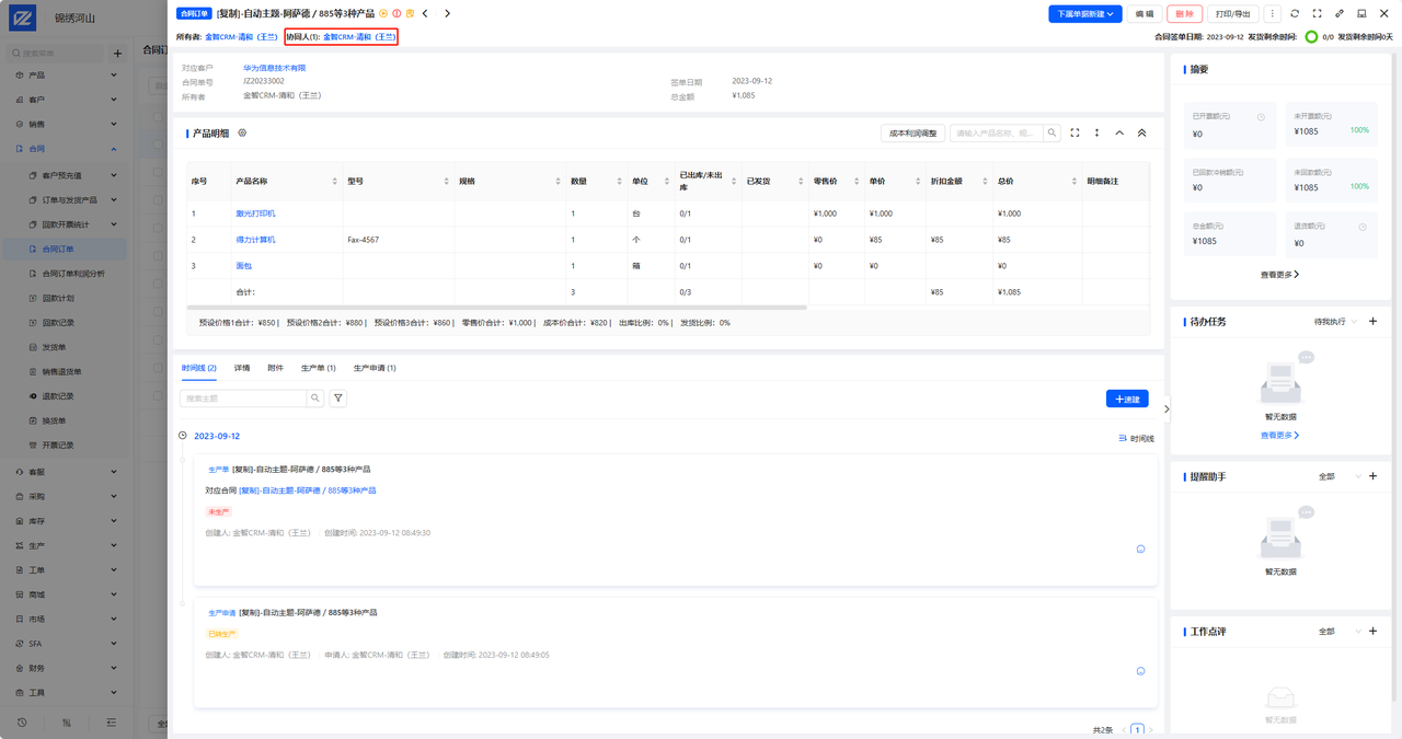 合同视图、采购单视图,”共享协同人“都统一放到所有者右侧(加“更改”操作按钮),操作和“销售机会”单据一致,不需要在顶部更多三个点的展开操作中出现。