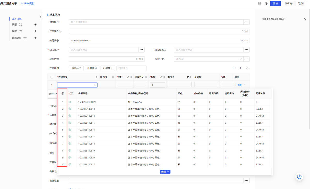 "选择产品"能自定义提取产品信息列,部分字段需要新建单据时用于参考。通过增加一列排序号,顶部小齿轮放列设置。