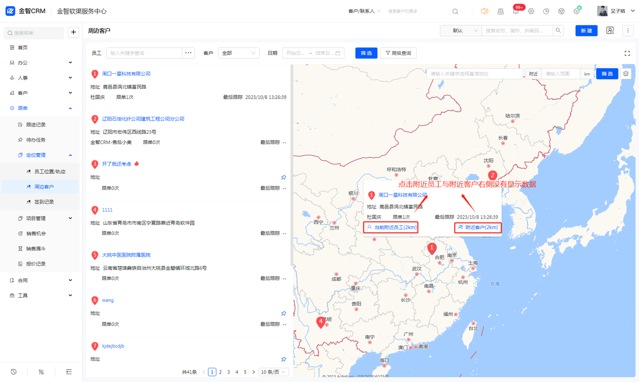 周边客户-点击查看附近员工与附近客户时,右侧有列表展开能查看搜索的结果,可以展开收起,避免附近员工或附近客户,地址挨得太近看不清楚。客户视图、供应商视图中右上角的”客户地图“,要按照“详情中- 单位地址”打开的显示效果显示,可以查看周边客户、周边员工,满足查看周边员工、周边客户的情况。