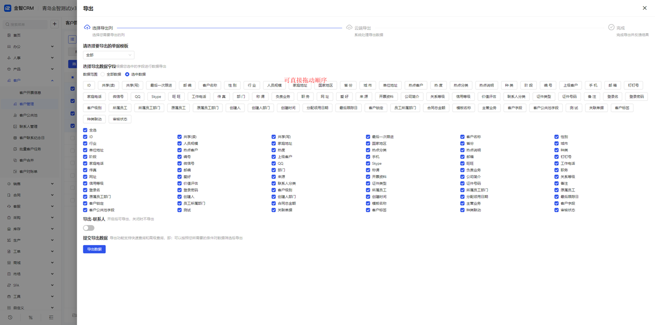 (2)导出字段选项的先后顺序,支持拖动先后,按照拖动后的先后,作为用户导出表格数据的先后;