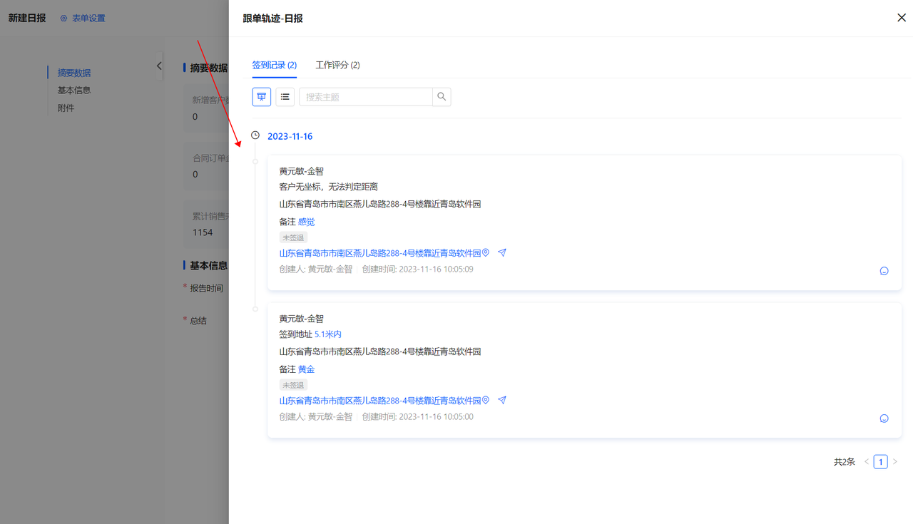 日周月报新建页面,摘要数据右侧增加“跟单轨迹”,点击即可侧边栏打开方式,提取显示时间线效果,提取员工日志页面显示的摘要数据。