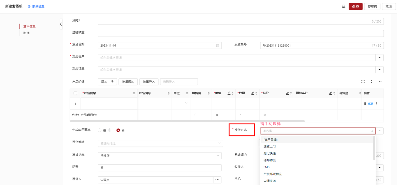 (1)发货单表单设置-发货方式-默认的发货方式为准;
