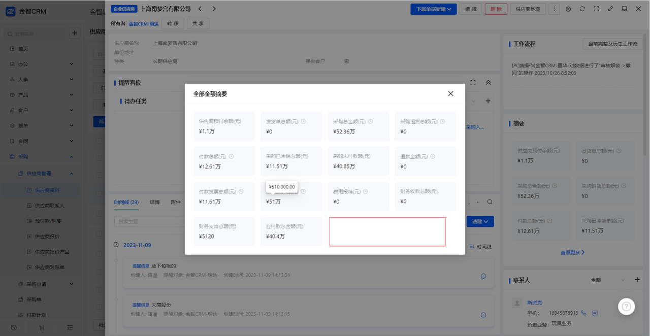 供应商视图右侧金额摘要增加预付款总额,预付款余额,已入库金额,未入库金额。