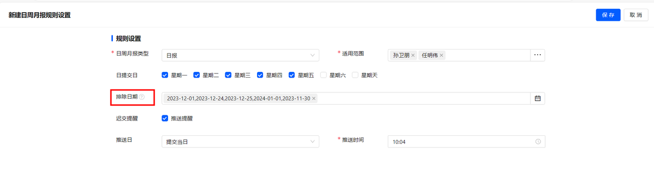 日周月报设置增加一个“特殊日期”排除,可以手动排除特定假期,方便管理员更灵活设置提交时间。同时, 计算日报提交数量时、推送提醒时,也会排除指定的特殊日期。
