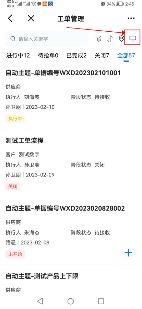 顶部增加“工单看板”图标,点击打开新页面,提取PC端工单工作台数据。