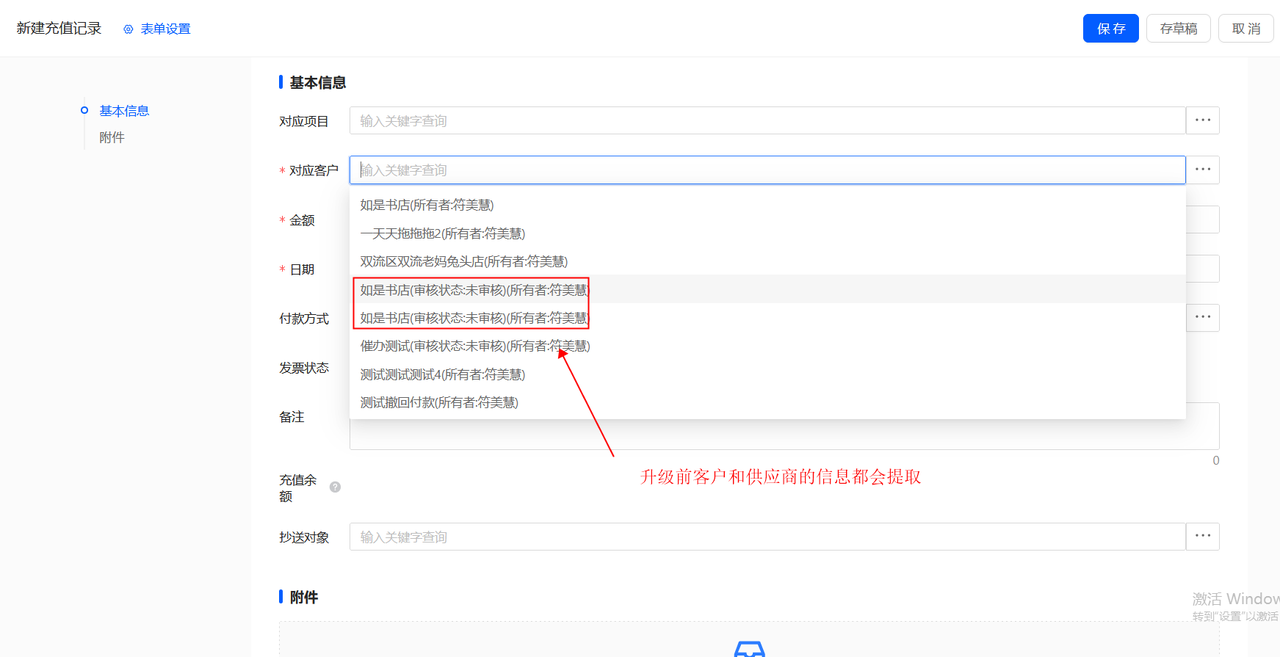(1)合同-客户预充值/消费,选择客户,不应该提取供应商信息(未兼做客户);