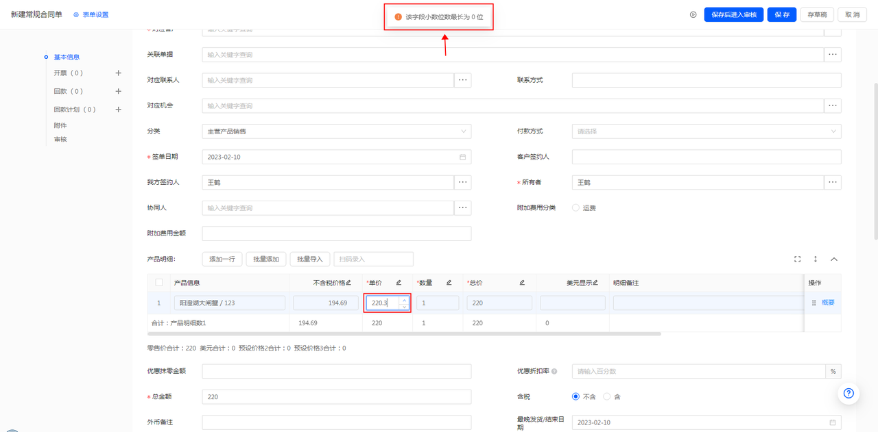 (2)价格精度设置成整数,则产品明细列的单价不允许写小数。若填写了小数,系统提示文字优化:精度设置规则只允许填写整数;