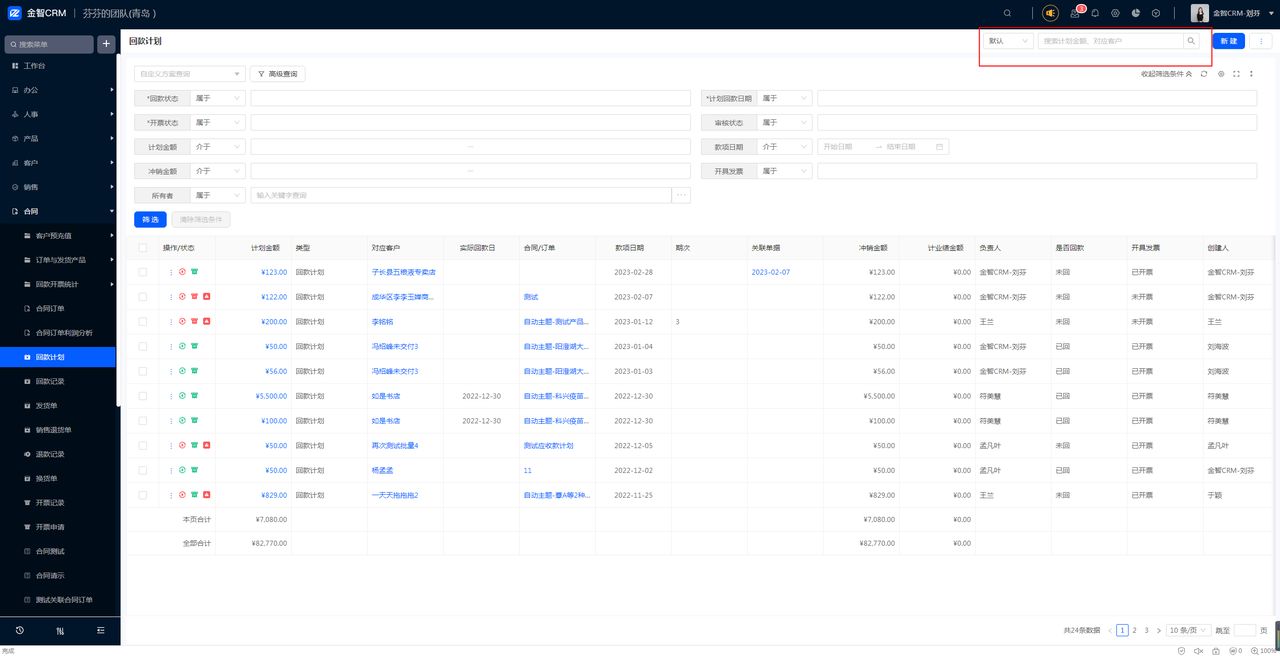 回款记录列表的关键字搜素,实际搜索效果扩充支持到合同订单“主题和单号”的关键字搜索。