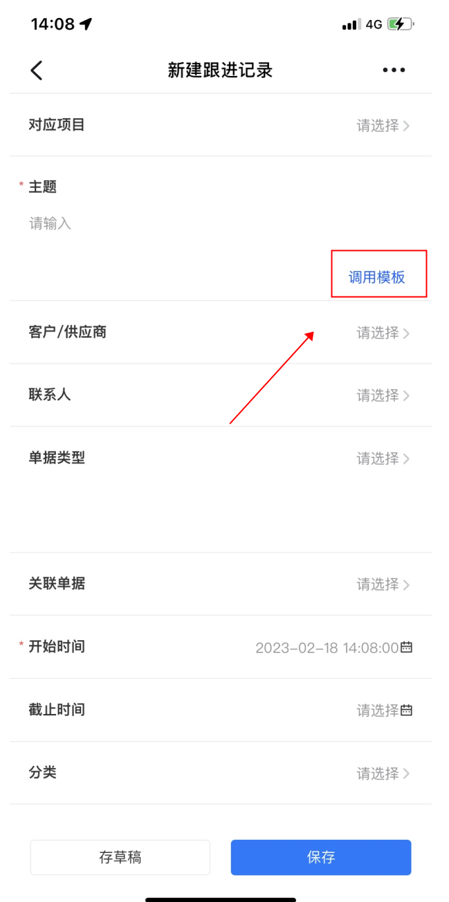跟单记录主题、待办任务主题设置可选快速调用模板。调用模板文字后,可以修改,节省输入时间。