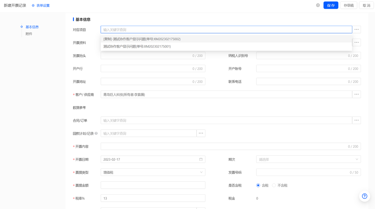 (1)新建单据页面,选了对应项目(若项目有主客户且无其他协作客户)后,直接将客户名称提取到单据的对应客户字段中。