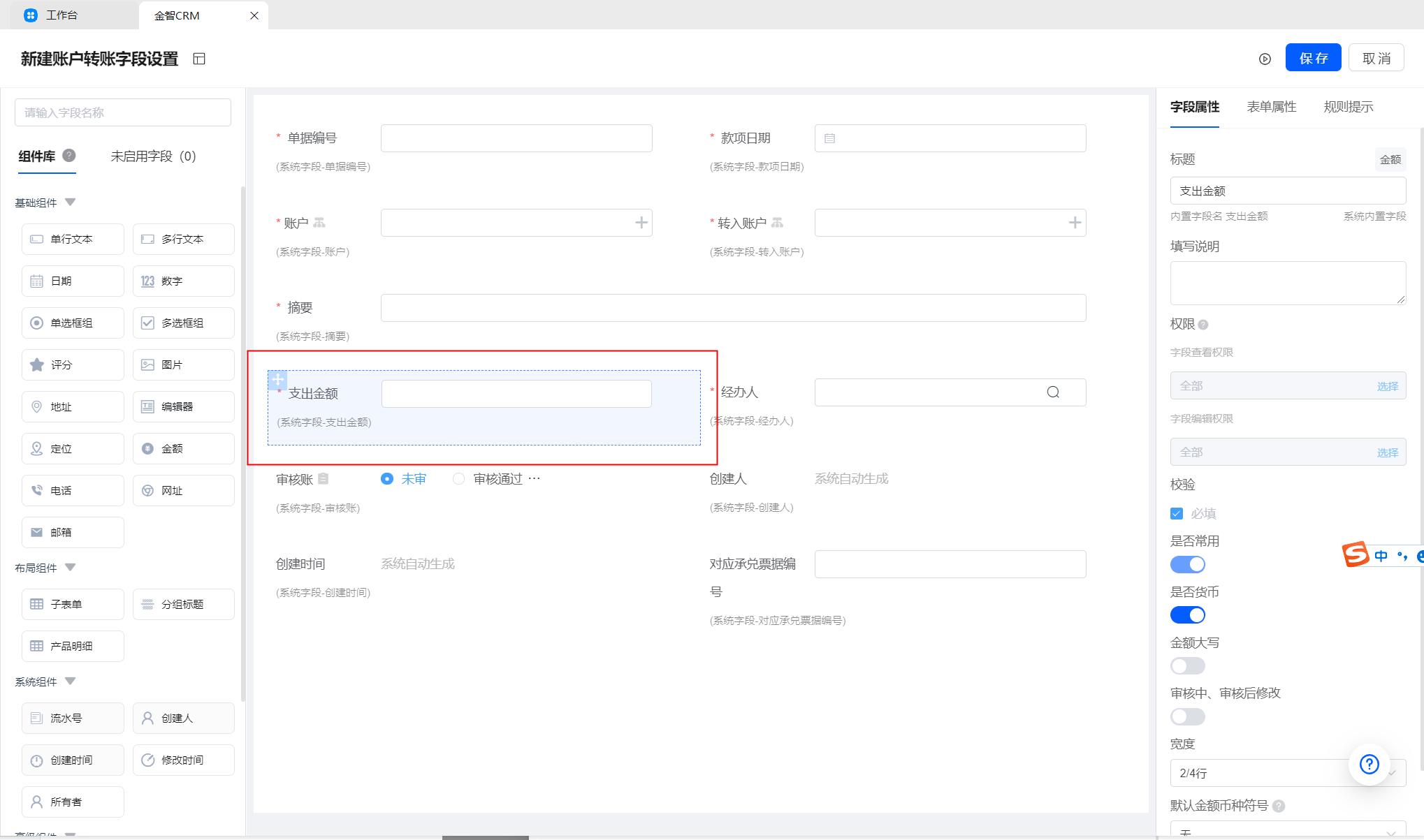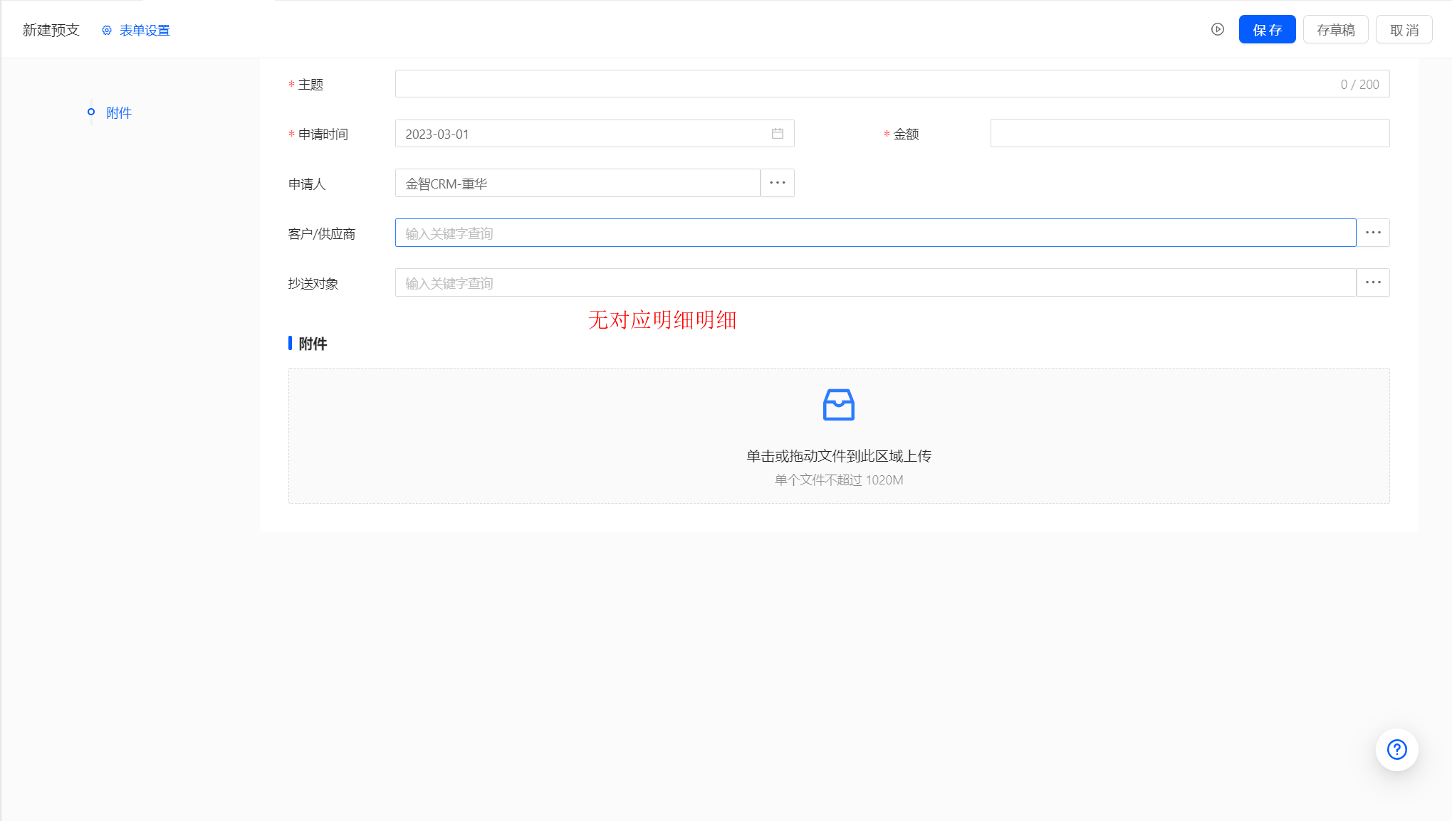新建/编辑预支/预付页面,即使销账明细字段设置了开启,新建/编辑页面也不需要显示、不能填写,只能在新建销账页面进行填写,保持数据显示和销账属于预支预付保存后的后续操作逻辑一致。