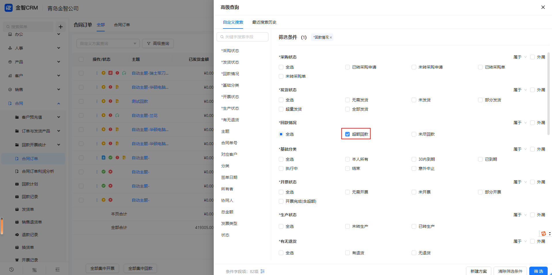 (2)货款情况增加“超额回款”查询项,满足实际回款超过合同货值的情况筛选诉求。