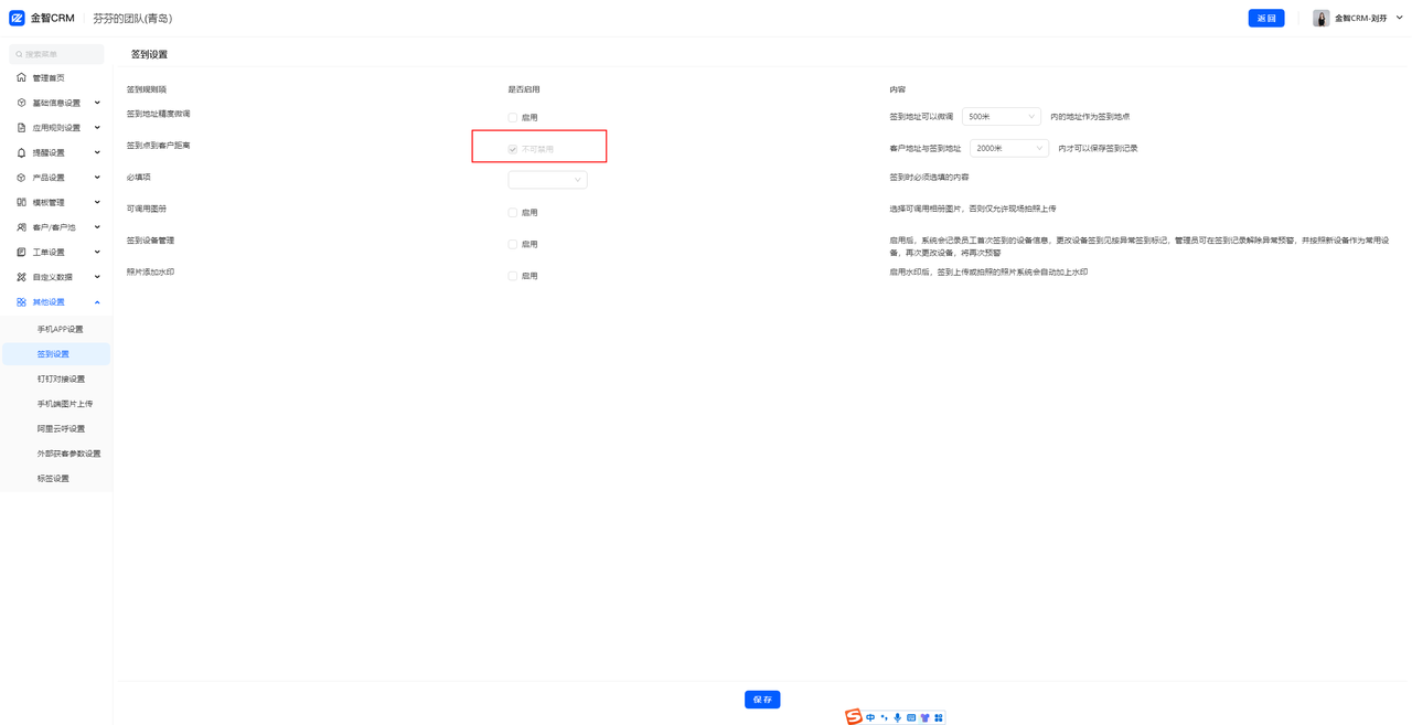 将签到点距离客户地址,改为是否启用的模式,启用后可以设置距离,不启用不限制签到点和客户地址距离(场景:工程类客户,客户地址填写客户办公地址,但是签到地址可能是在多个工地)。