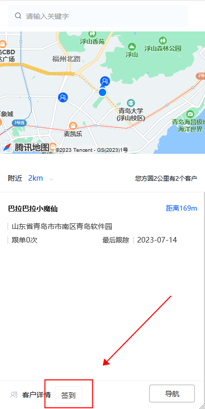 导航按钮的左侧增加签到按钮,点击签到按钮后,不需要选择客户名称,直接可以完成签到。