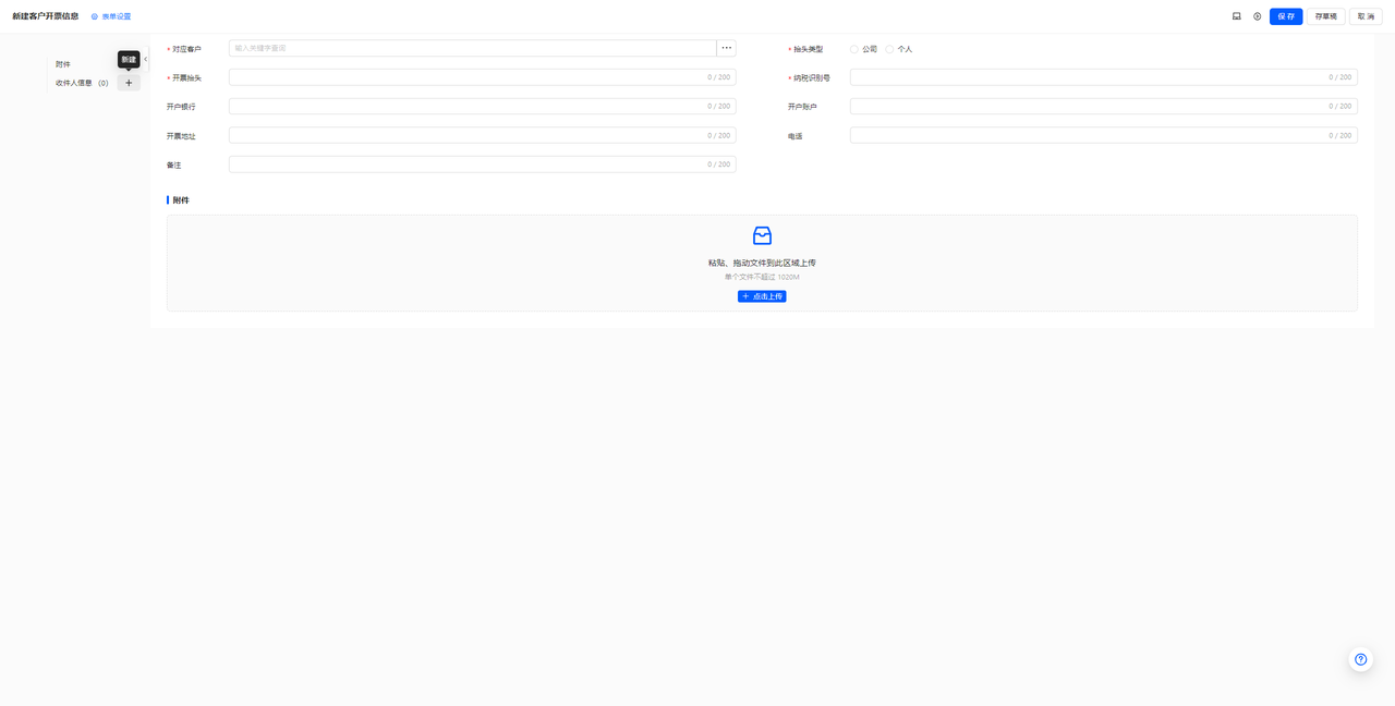 新建客户开票信息时,收件人可以调用,可以新建。取消左侧导航条的收件人信息,提取单位地址,可填写备注,将收件人作为一个独立标题,左侧有导航条的新建收件人信息删除掉。