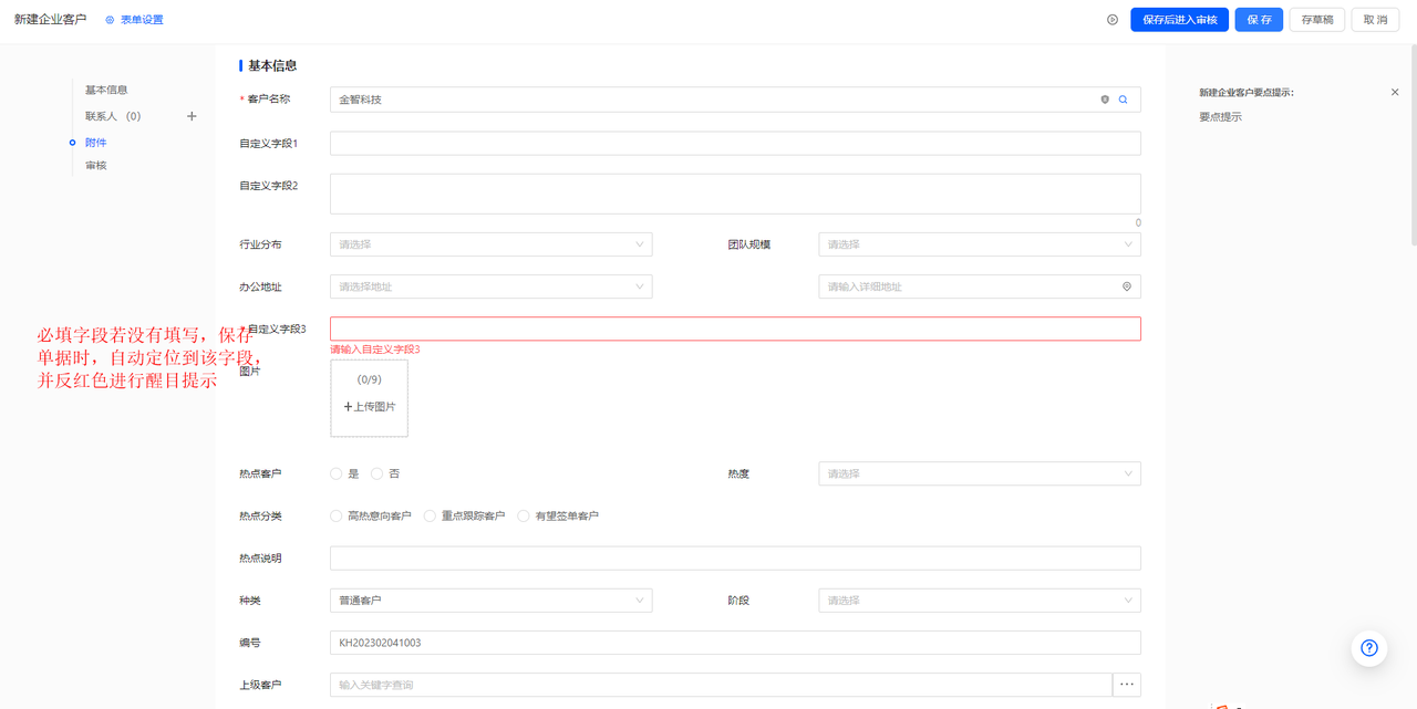 新建表单时,必填字段若未填写,则自动定位到该字段并用红色提示。