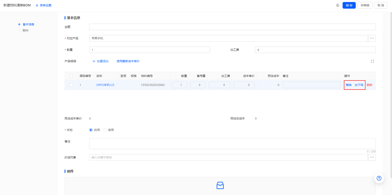 新建/编辑物料清单页面,替换、加下级,两个按钮做成蓝色按钮,醒目清晰。