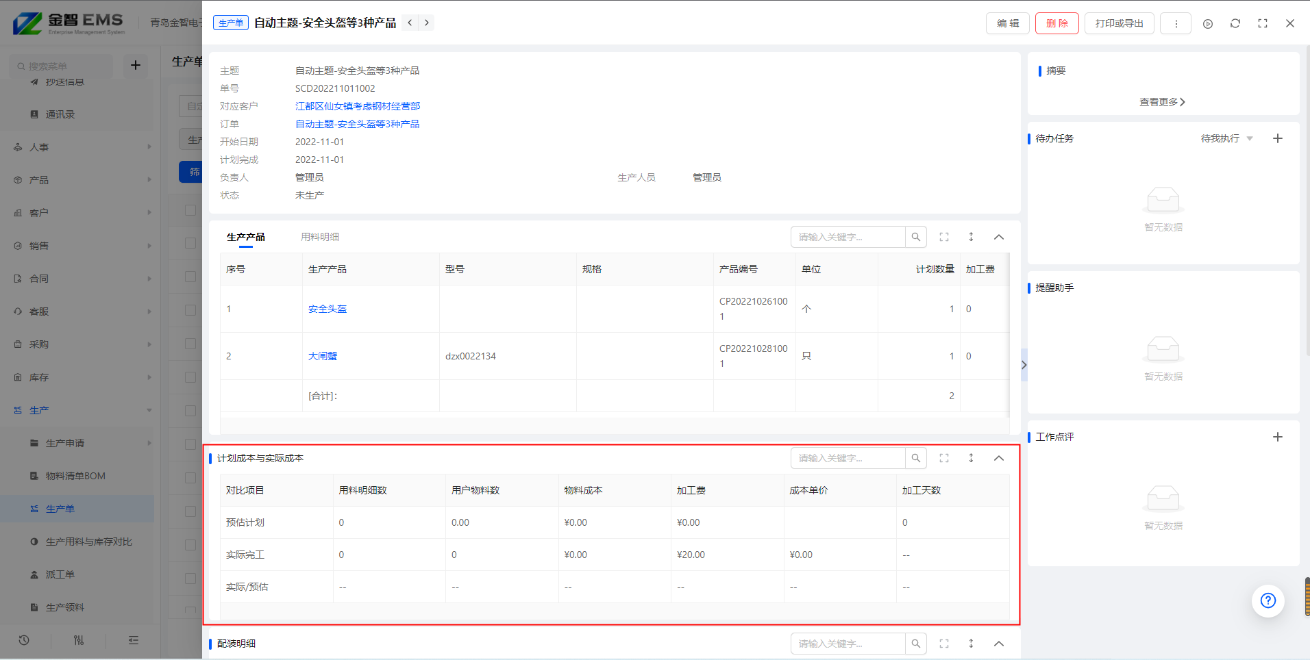 生产单-原升级成本为物料清单计划用料与计划用工成本,新增可选实际成本。
