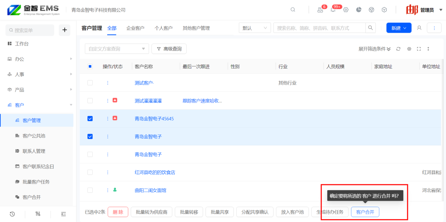 客户列表、公共池客户列表底部增加【客户合并】按钮,默认为2个客户的合并;最多支持3个客户合并,客户合并改为可选客户资料字段合并,不再限制一个客户资料整体并入另外一个客户资料中。
