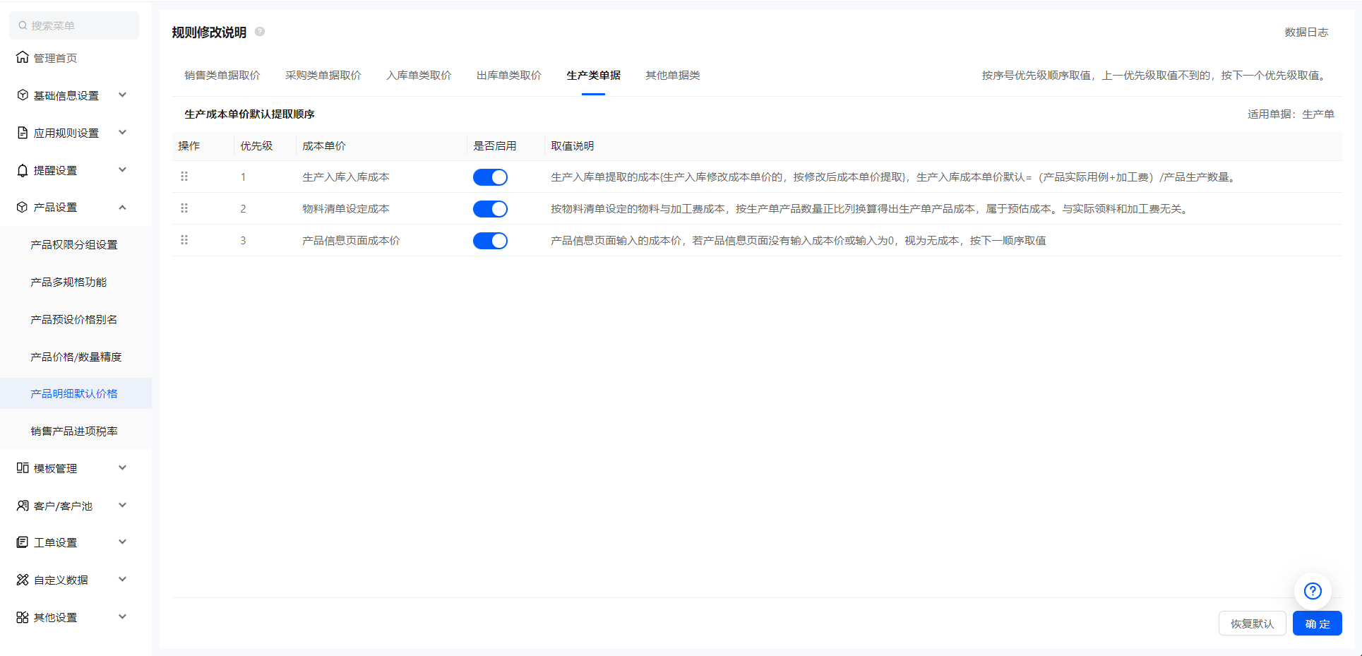 系统设置增加“产品明细默认价格”规则,可根据需要设置价格的默认提取顺序和启用项,按序号优先级顺序依次取值,最少保留一个默认价格