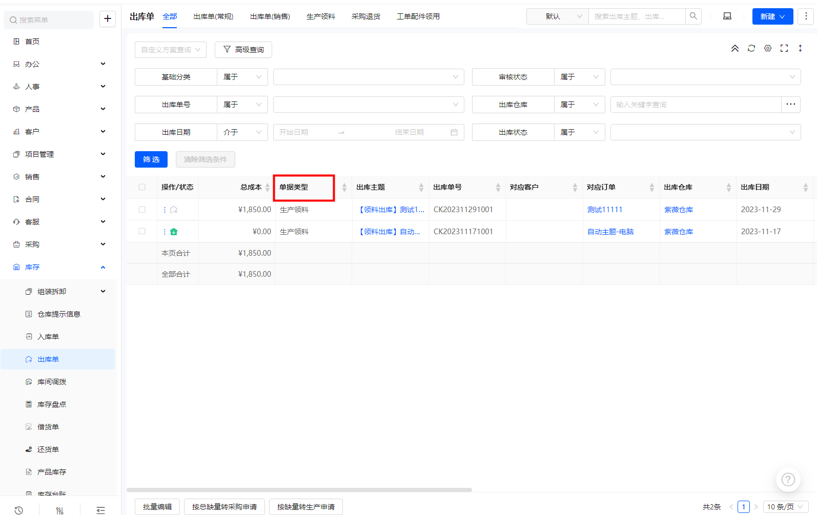 (2)出库单的单据类型有:常规出库、销售出库、采购退货、生产领料、工单配件领用。