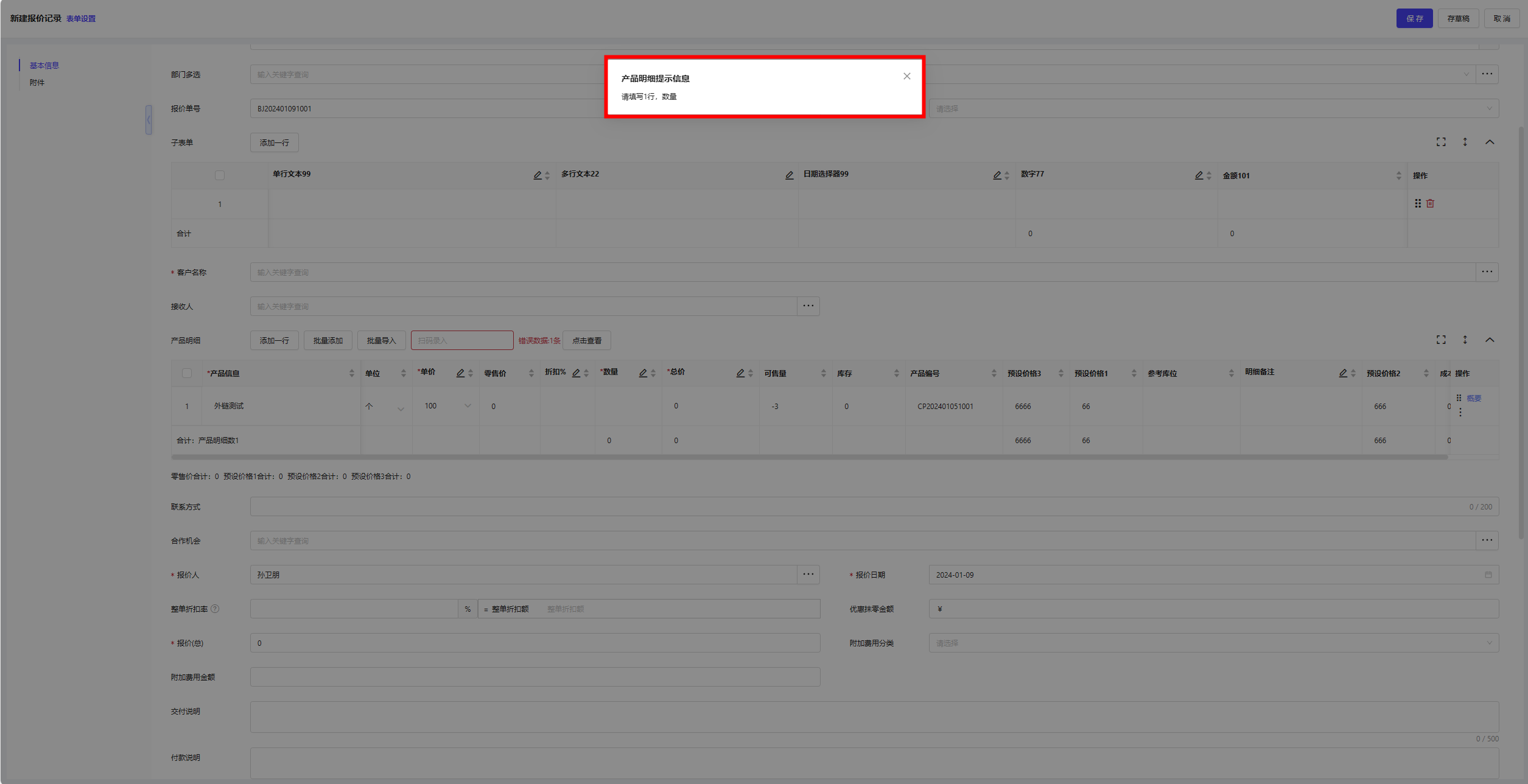 包含产品明细的单据,如果有必填项未填写保存时给出红色提示,方便用户快速定位到具体产品进行补充信息。