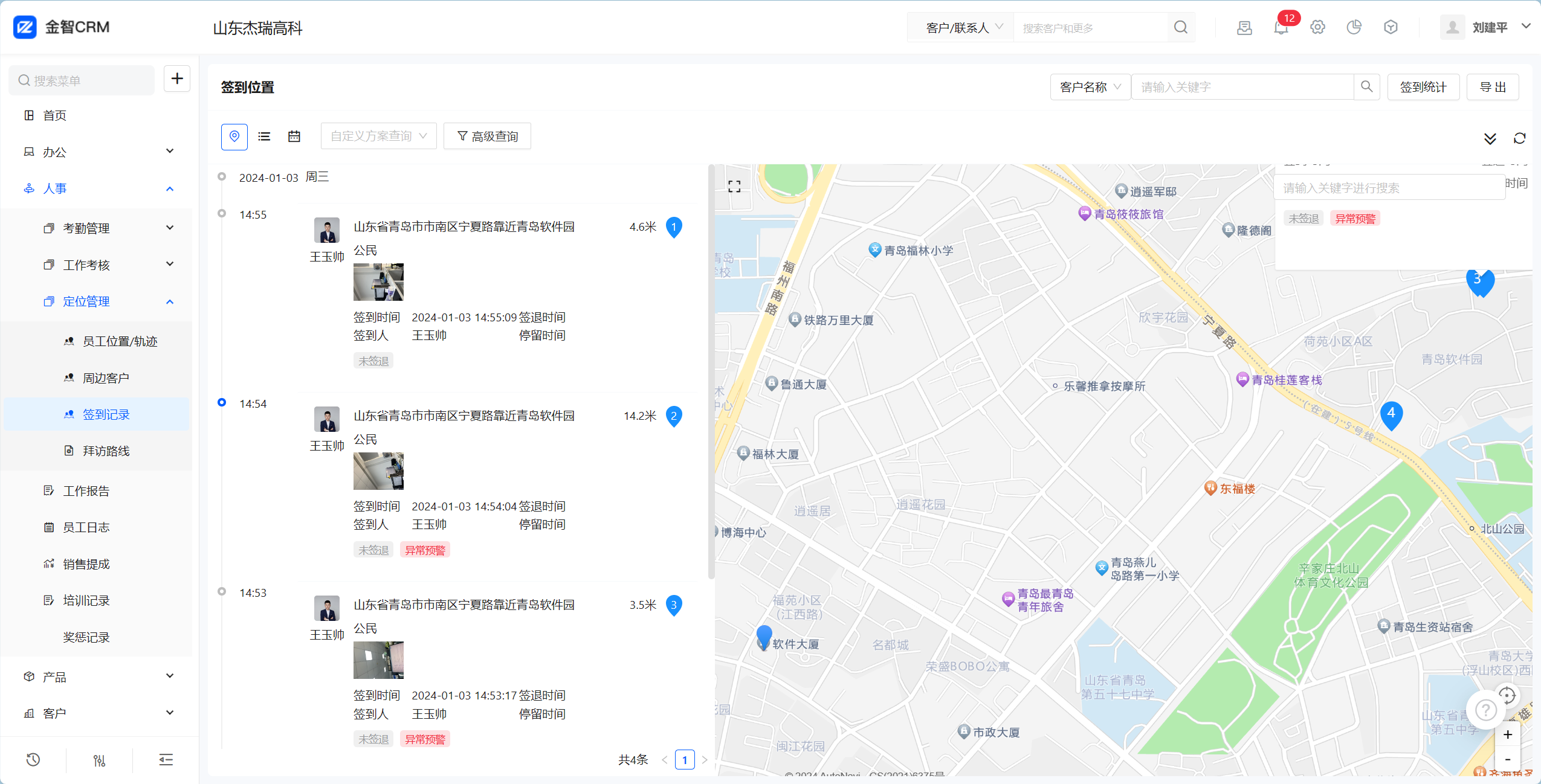 签到统计页面,将员工签到统计调整到左侧;右侧增加客户签到统计,提取客户签到统计次数、签退次数、异常(设备异常)次数等数据。满足用户统计签到信息查看需求,也可以进行导出。
