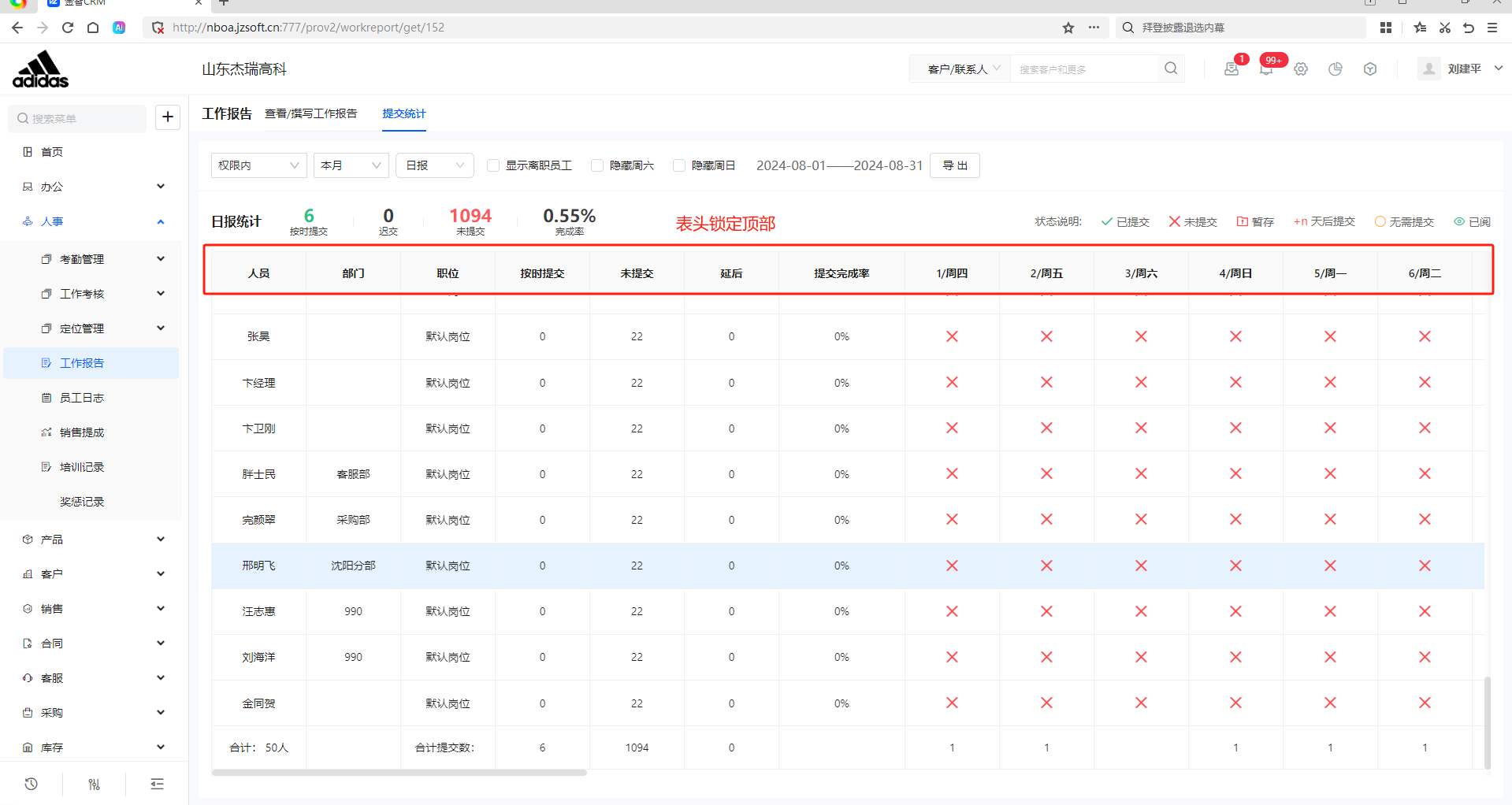 工作报告-提交统计页面优化:员工多的情况下,顶部表头固定首行;底部滚动条浮动在页面底部,无需滑动到最后一个员工才可拖动调整。