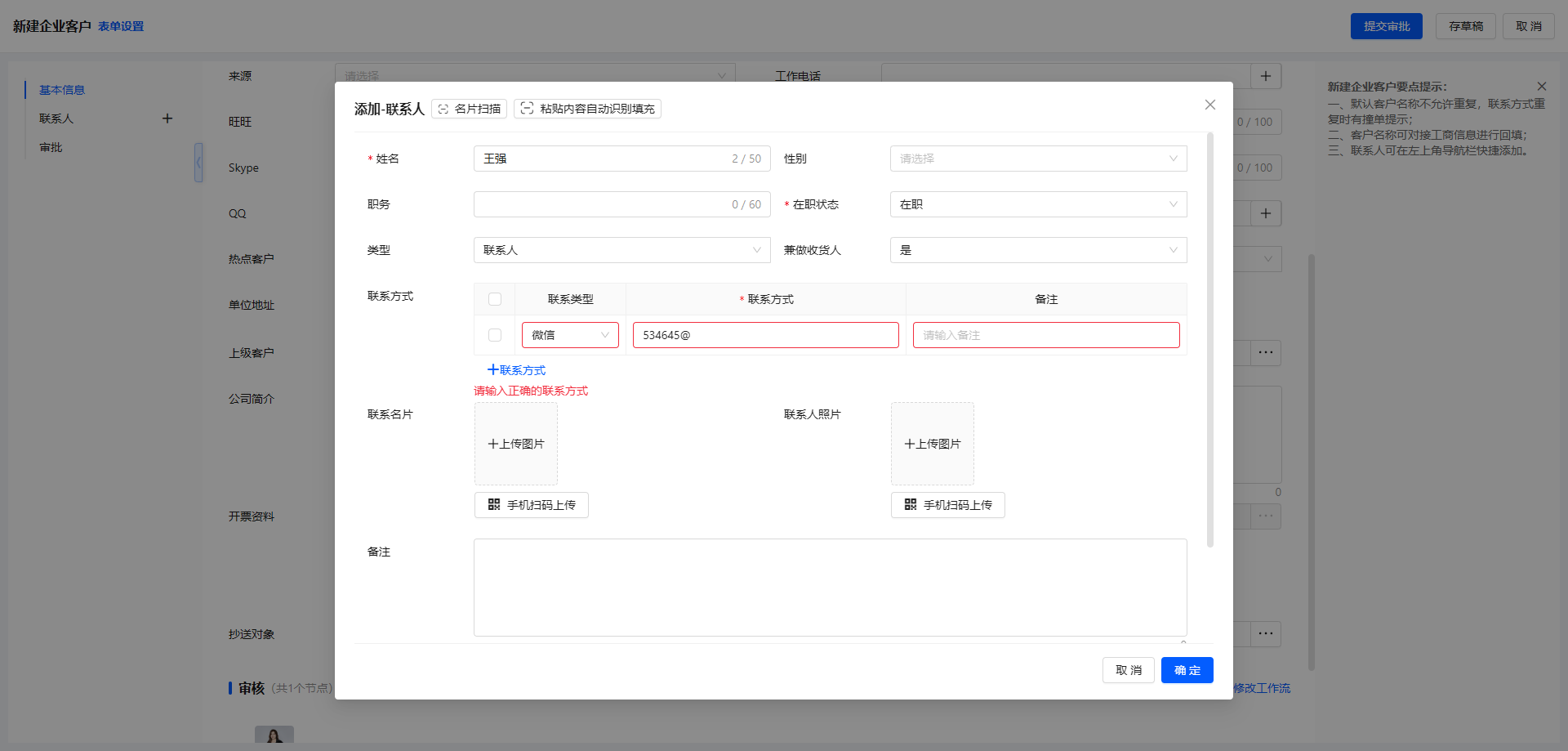 客户和联系人联系方式-微信,取消账号自动验证,允许输入任何字符,兼顾不同格式的微信号码的录入。