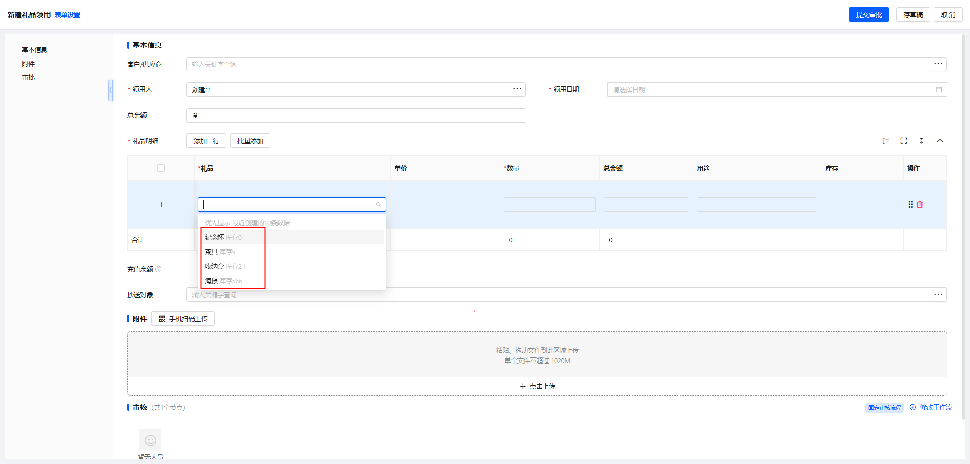 PC端礼品下拉选择和移动端选择礼品页面优化显示礼品库存数量,便于直观了解所有礼品剩余库存数量进行选择领用。