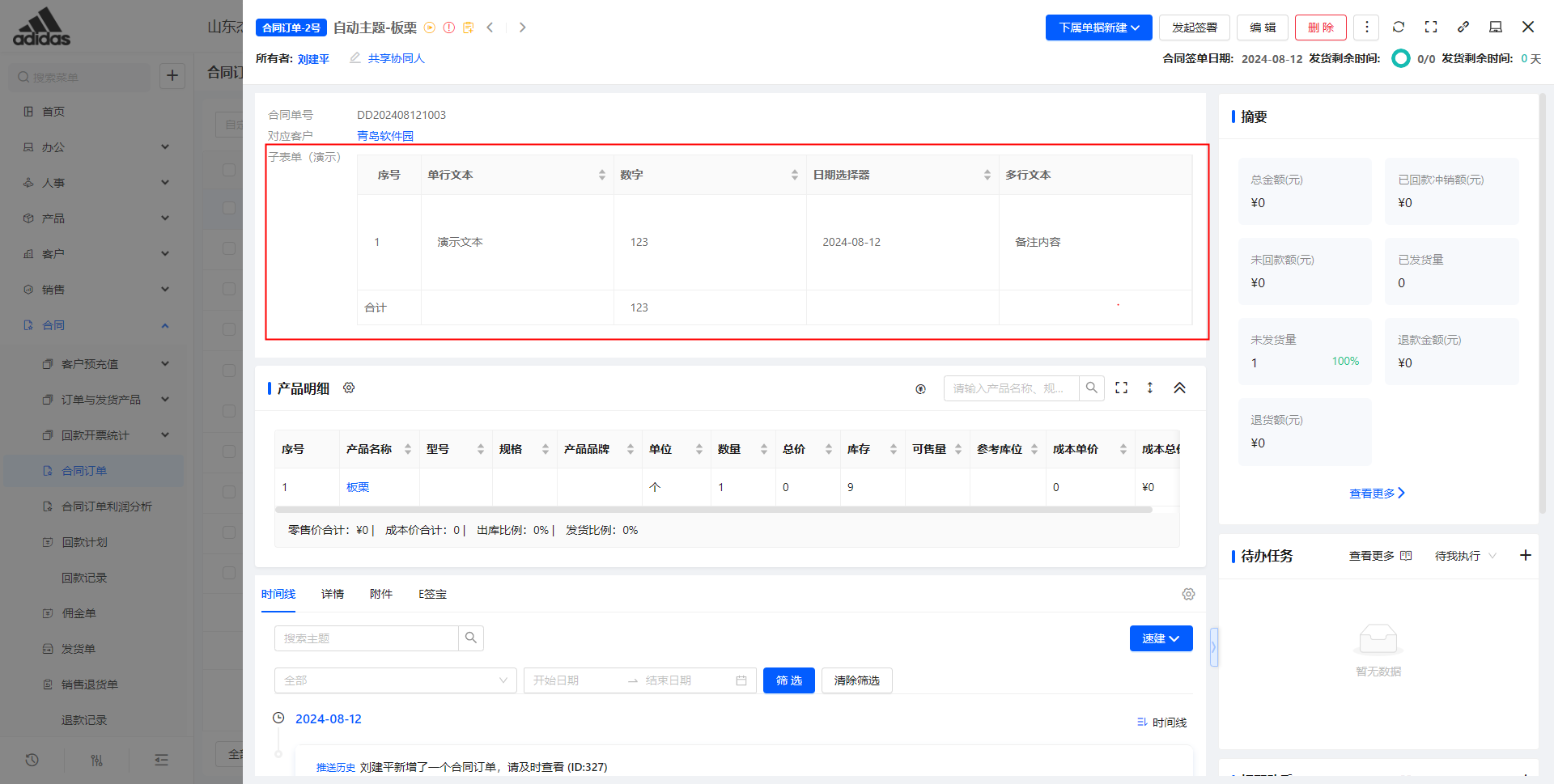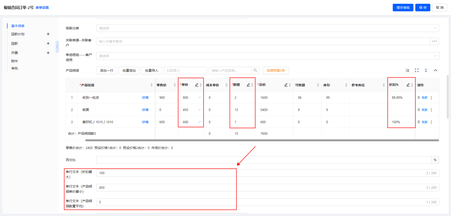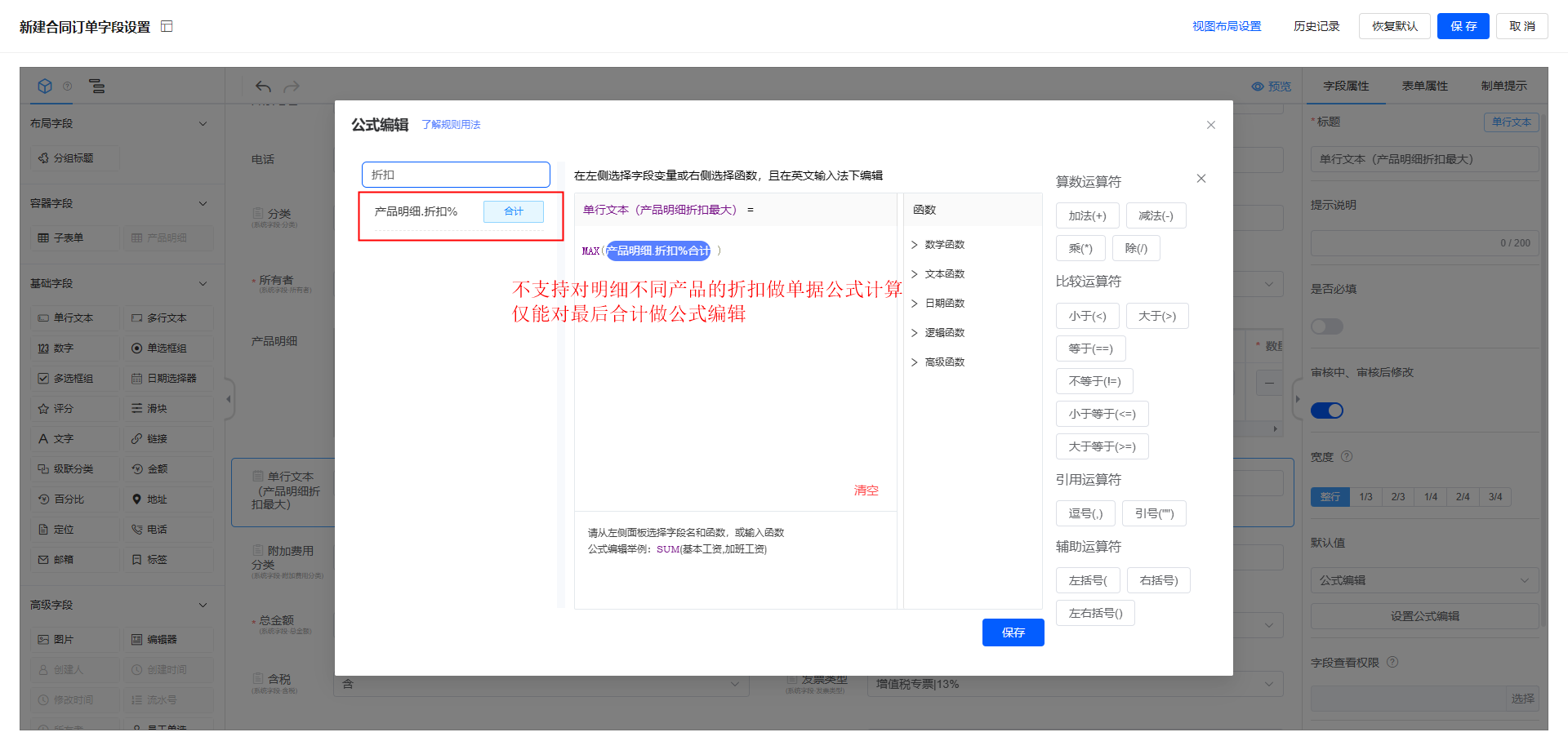 主表字段设置公式编辑(合计、平均值、最大值、最小值)时,支持选择产品明细的金额、明细字段,可快速对明细内数据进行公式计算提取。