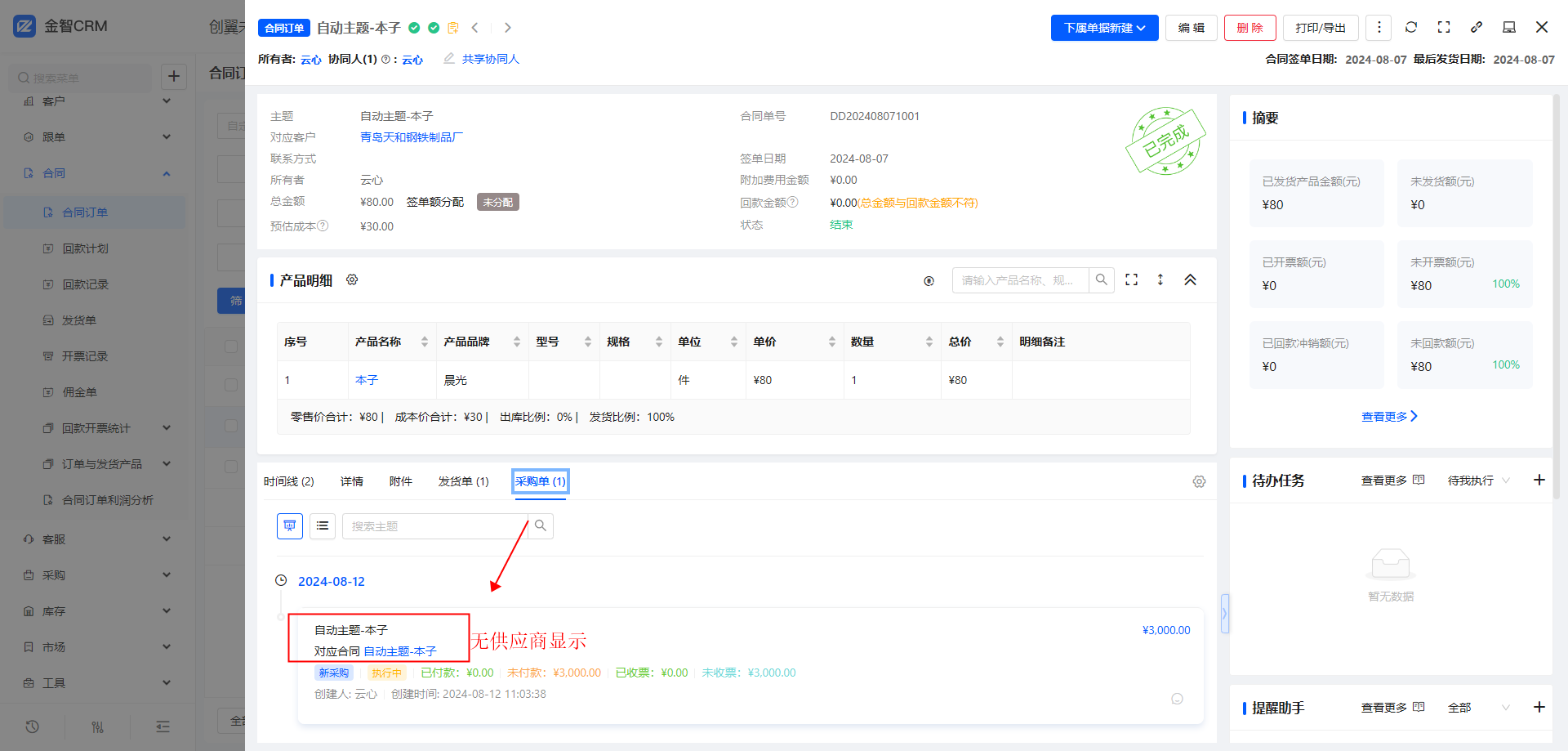 合同订单视图tab菜单-采购单-卡片模式下,显示采购单对应供应商信息。