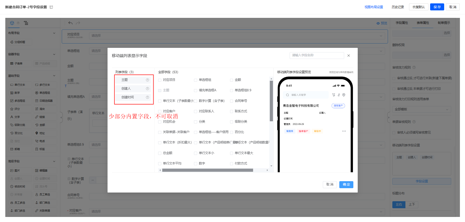 移动端列表字段设置优化(主题、创建人、创建时间、标签和特殊操作按钮不支持取消,其余字段用户可以自由设置)。