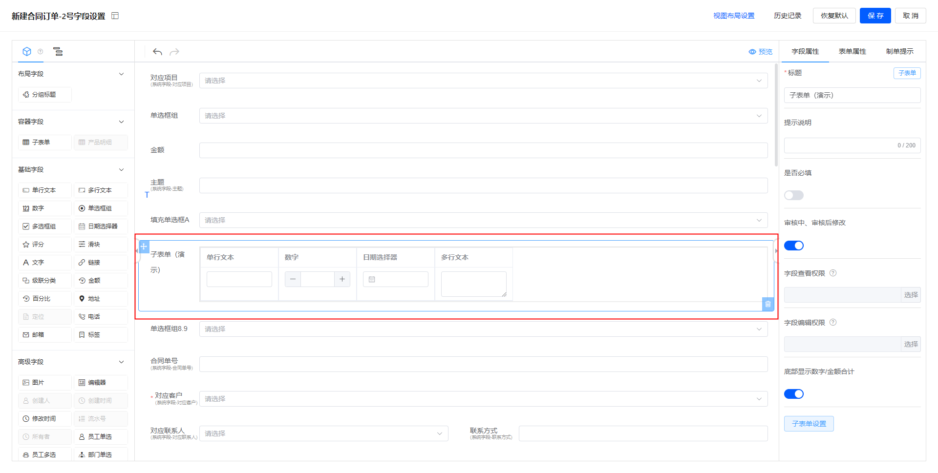 表单自定义添加的‘子表单’组件,允许在视图布局设置中,设置显示在单据视图上方的摘要区域。