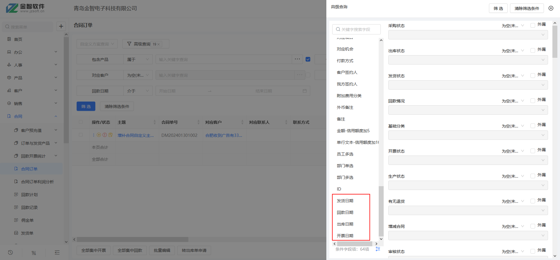 合同订单高级查询增加:回款、发货、出库、开票的日期条件,用户按需选择是否显示在合同订单高级查询字段中。满足按下属核心单据的制单时间范围查询筛选合同订单。