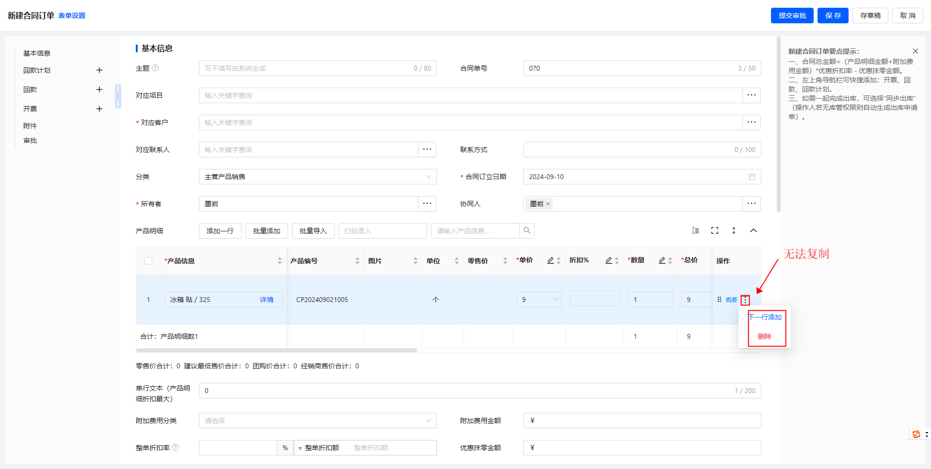 新建单据页面-产品明细-增加“复制到下一行”功能。