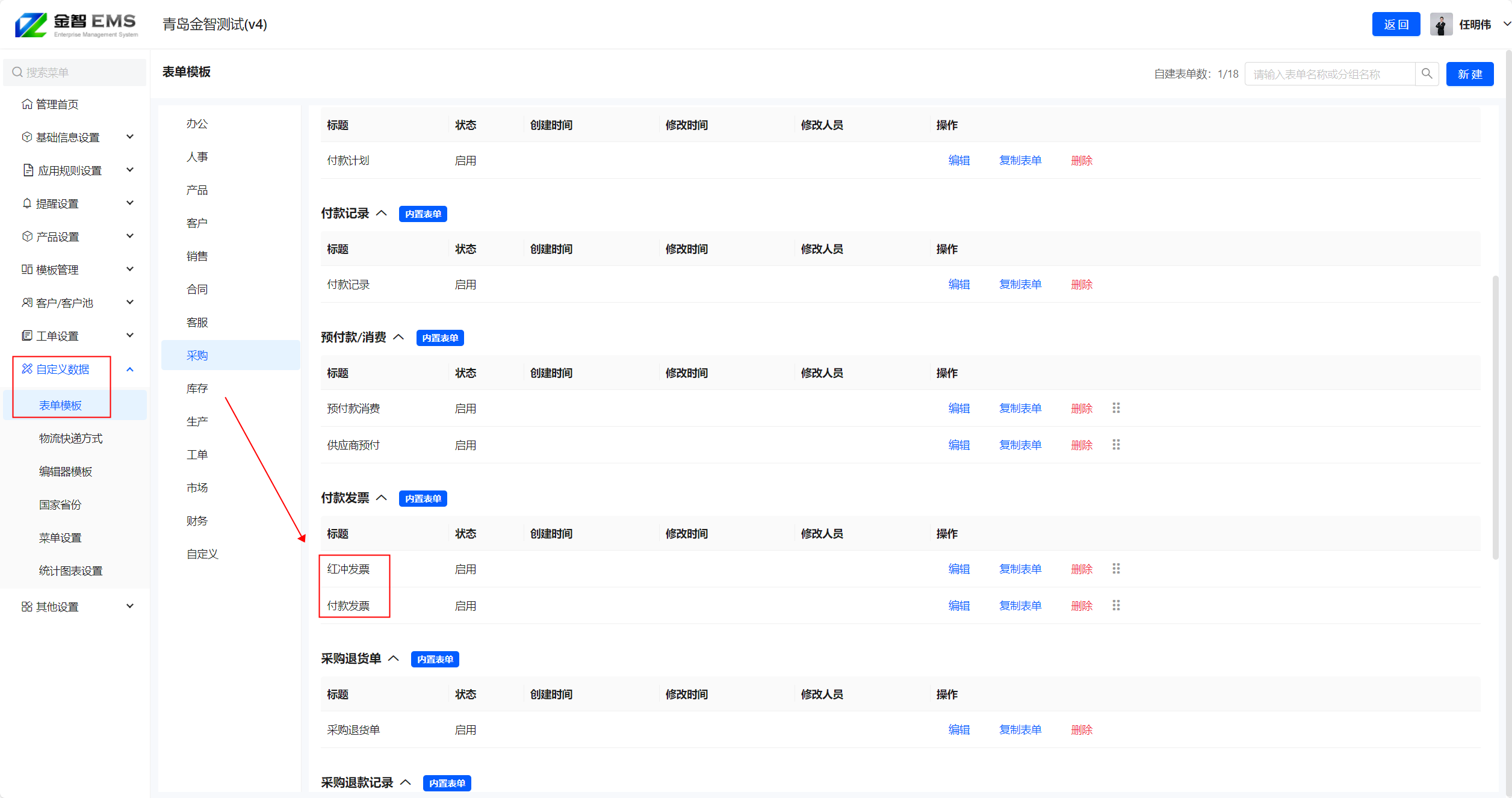 系统设置-自定义数据-表单模板,显示 “付款发票”、“红冲发票”的模板设置;